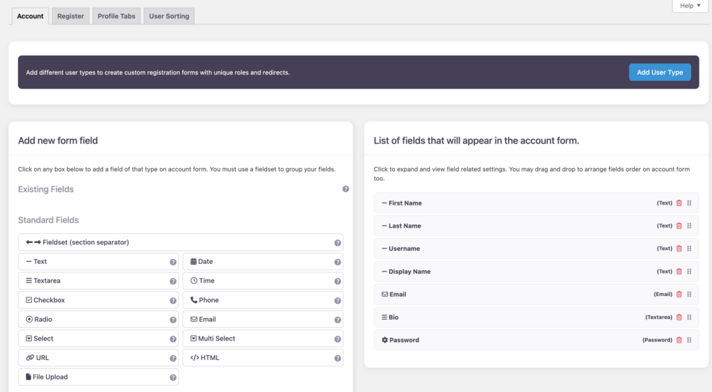 UsersWP has an intuitive Form Builder that can be used to quickly add registration and account forms to your site. There is no limit on the number of forms that you can add.
