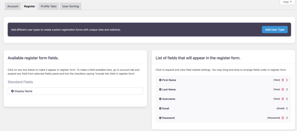 - Include This Field in Register Form? – If checked, the field will show up in the Available register form fields.