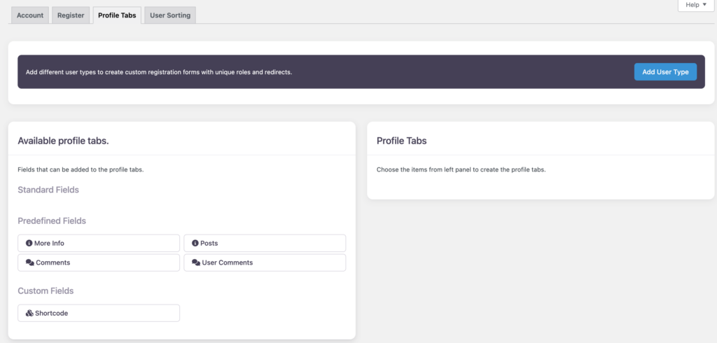 Similarly, you can add profile tabs to specific forms from the page UsersWP > Form Builder > Profile Tabs.