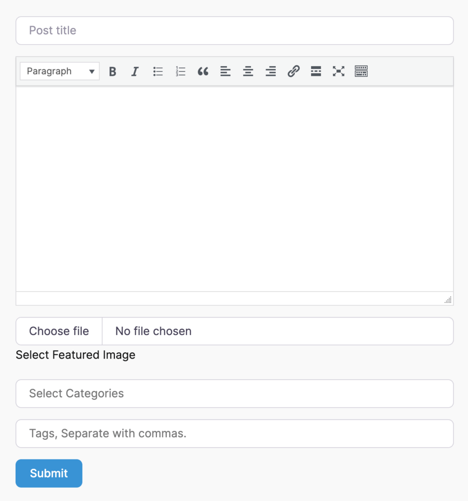 The UWP > Frontend Post Form widget can be used to display a form to allow users to submit post from frontend. In addition to the widget, you can use the [uwp_frontend_post] shortcode to display the widget anywhere on your site.