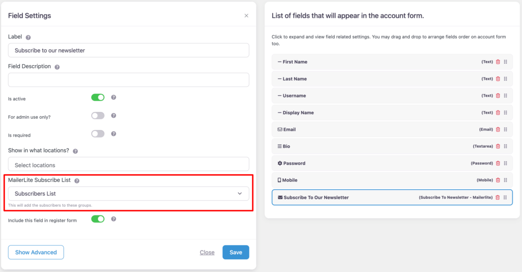In addition to that, a new field ‘Subscribe to newsletter – MailerLite’ is available in UsersWP > Form Builder > Account which can be added to the Registration Form that allows users to signup to your mailing list whilst they are creating a new account. You can select the list from the field option in which you want to subscribe user on registration.
