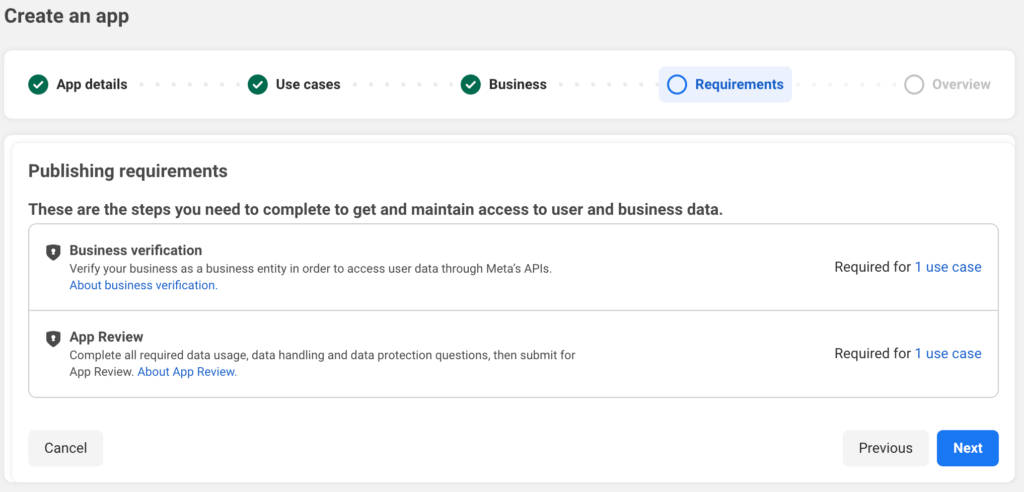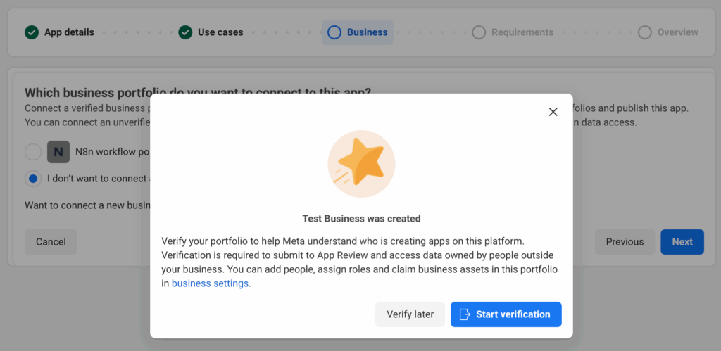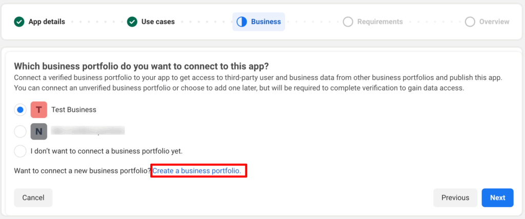 On next step it will ask for Business. You will need to create and verify your business portfolio to publish app. You can choose from existing one if you already have and then click on next.
