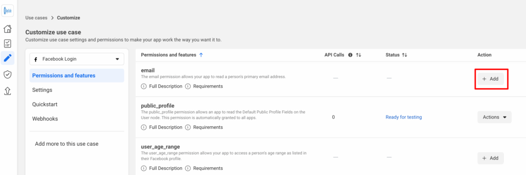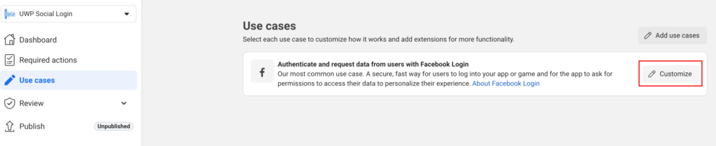 Next go to Use cases and click on Customise for the Facebook Login use case.