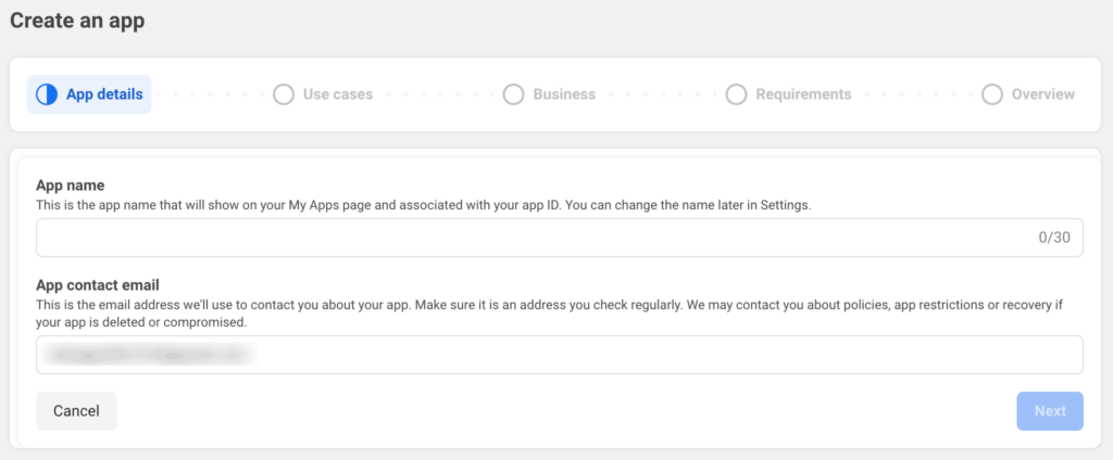 First go to Facebook Developer Site and Click on Create App button which will open following page where you need to enter App name and App contact email and click on next.