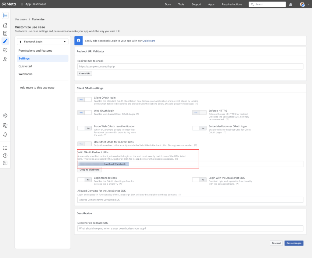 Now go to Settings and enter the Authorized redirect URI from UsersWP Social Login Facebook setting into the Valid OAuth Redirect URIs option in app and click on Save changes. The URI will look like https://yourwebsite.com/uwphauth/facebook.
