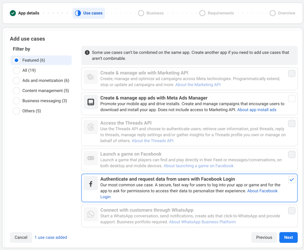 On next step it will ask for Use cases where you need to select Authenticate and request data from users with Facebook Login and click on next.
