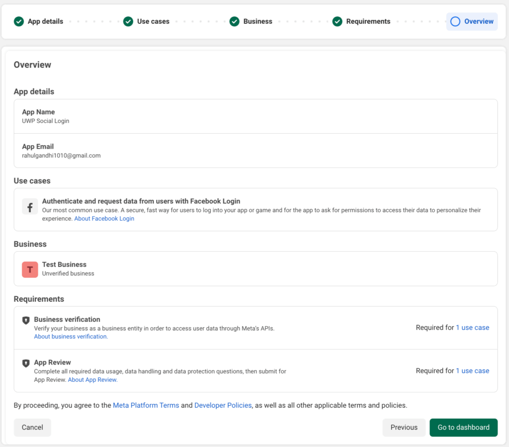Now, you need to complete the business verification process if still pending and publish the app and your website is ready to use Facebook social login feature.