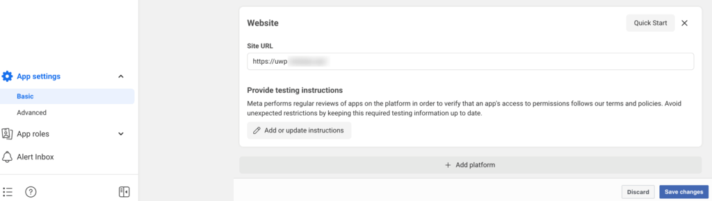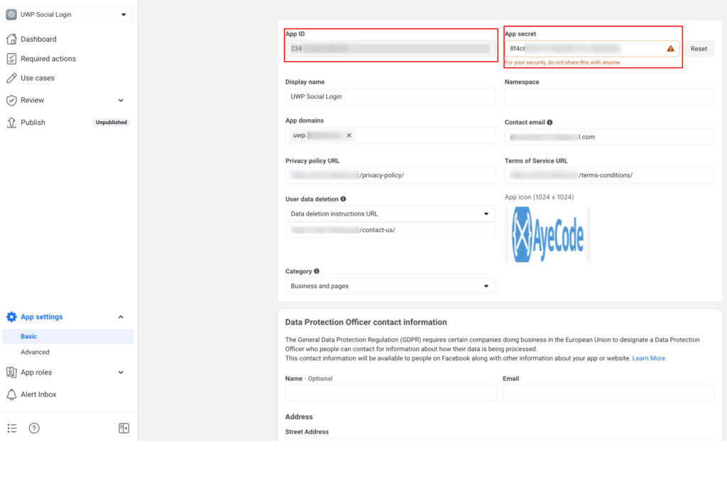On dashboard, go to App settings from left side menu and click on Basic. You will see the App ID and App secret which you will need to add into UsersWP Social Login facebook settings. Also, you need to fill out all required information in Basic settings to complete the setup else you will face issues in social login.