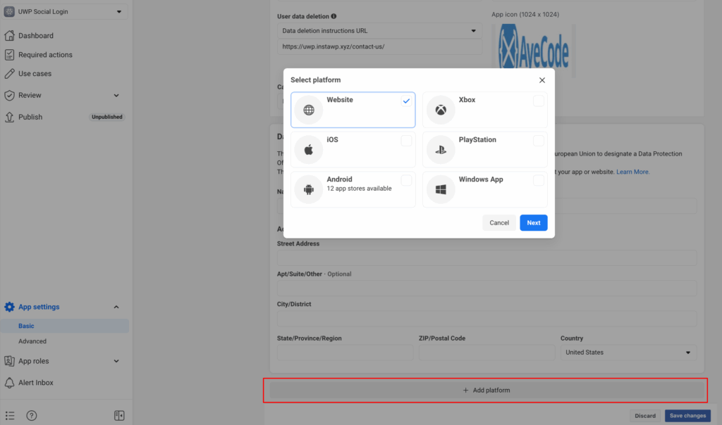Next you need to click on add platform button in the same Basic settings page and then select Website and click on next button.